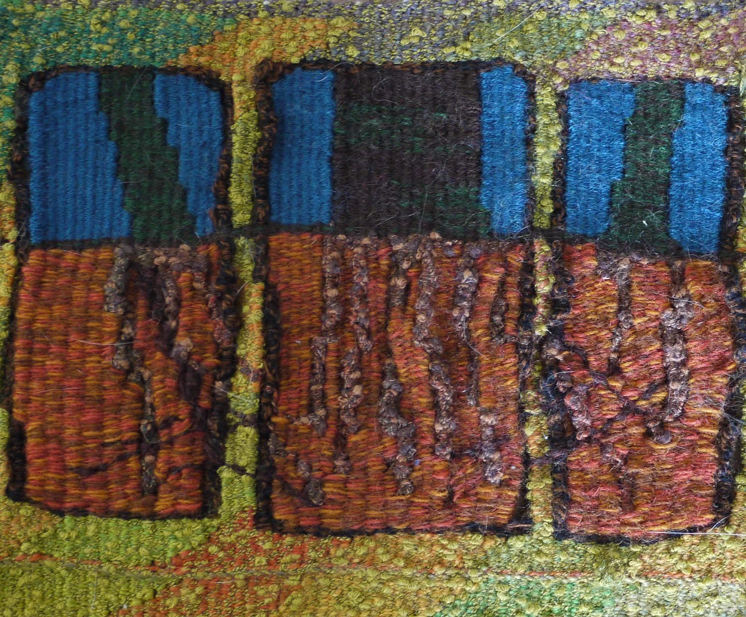 I had mixed feelings about it- still do - after completing this tapestry. It felt good to do a larger scale. I was happy with the mound and the emphasis on the roots, and I even liked the diagonals in the background. Other aspects, not so much.