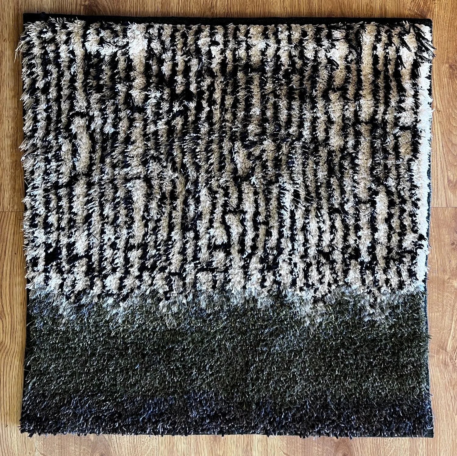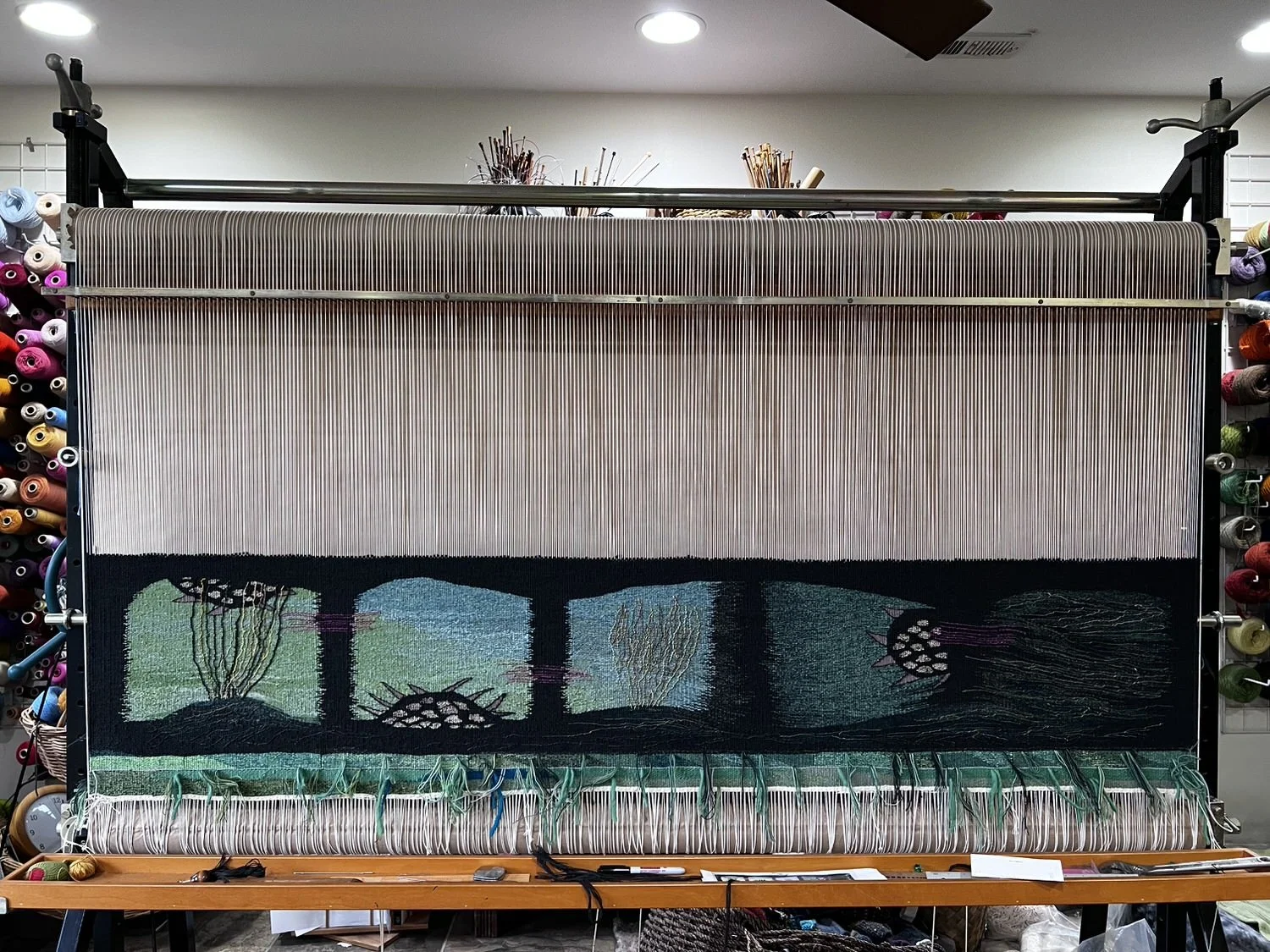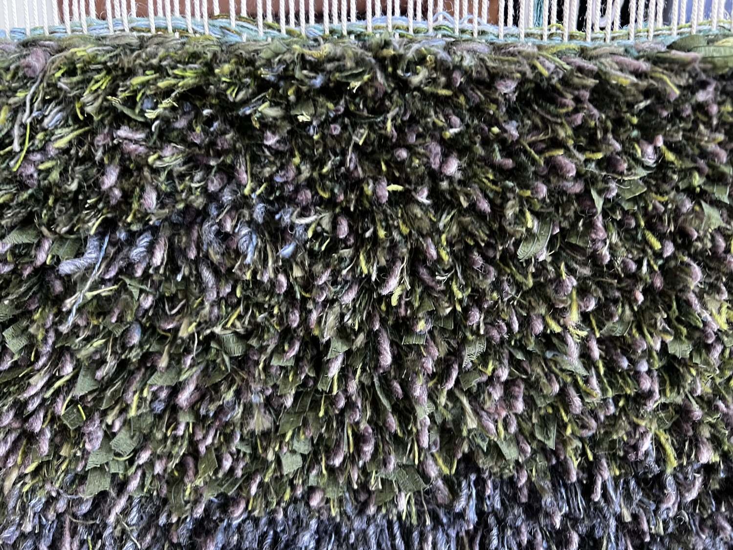 In October, I completed the other weaving I’d been working on intermittently throughout the year. There’s actually a lot more subtle color than shows here. At this point, as I write this in early January 2026, none of the weavings I cut off the loom have been “finished” and prepared for hanging. This is unusual for me. I normally get a piece ready to hang within a week or two after completing.
