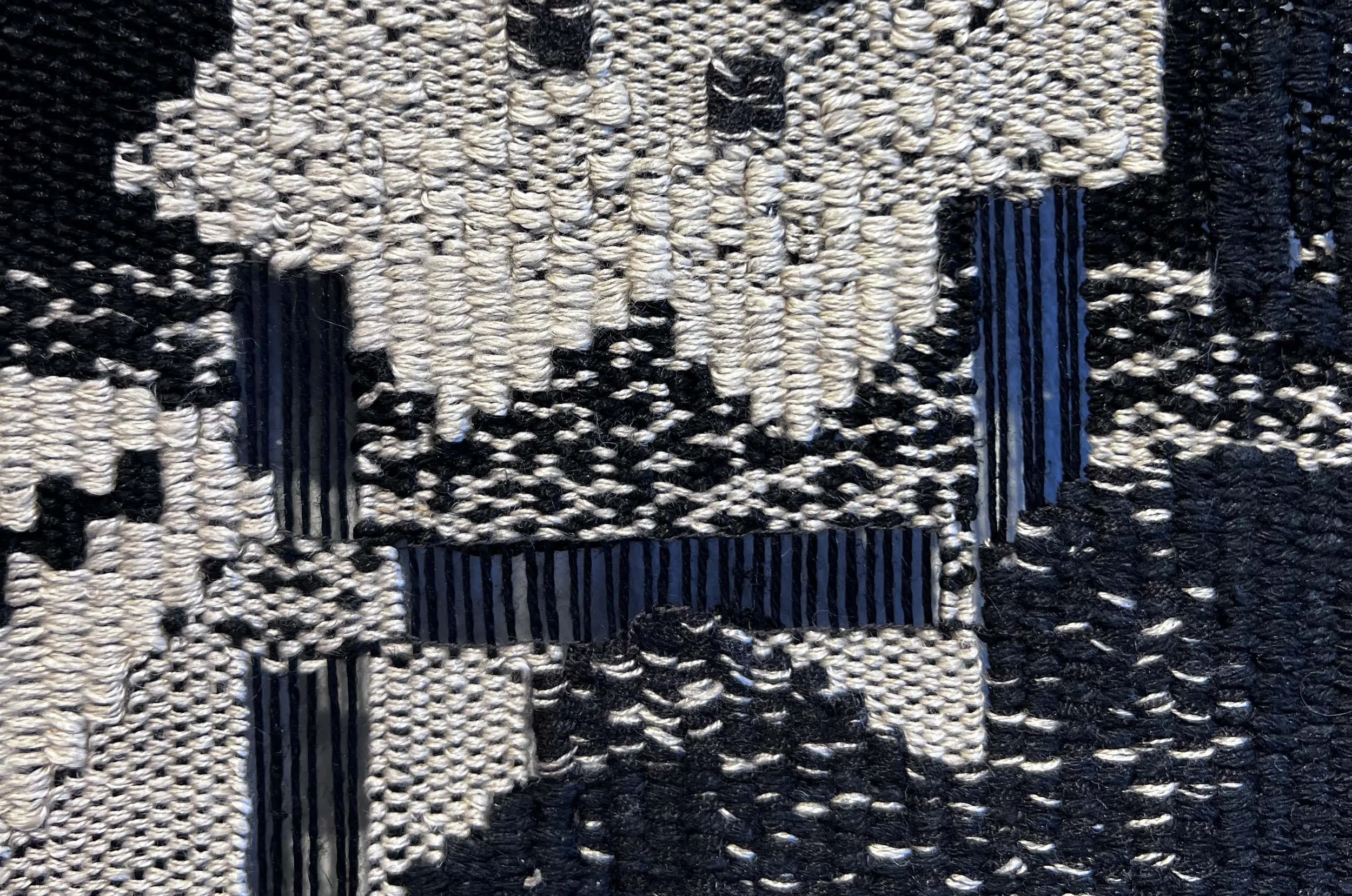 Isn’t that just brilliant? The double warp, single warps, and open warps together create such quiet movement - with the pastel coloring- behind the bold black and white vertical tufting. That shaped edge at the bottom!
