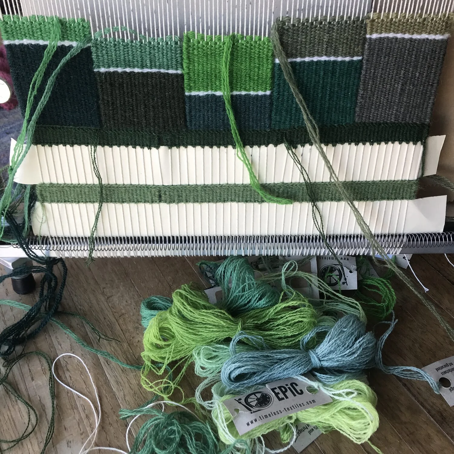 Two yarns I’ve been using almost exclusively are Borg’s Faro and Mora. I love Faro for the more saturated colors and that rustic almost hand-spun look and Mora because it’s finer (20/2) and smoother and gives me a completely different range of colors. I’ve also recently added EPiC yarns to my mix. I suspect EPiC has a bit of both these qualities, and am looking forward to getting to know this yarn better.